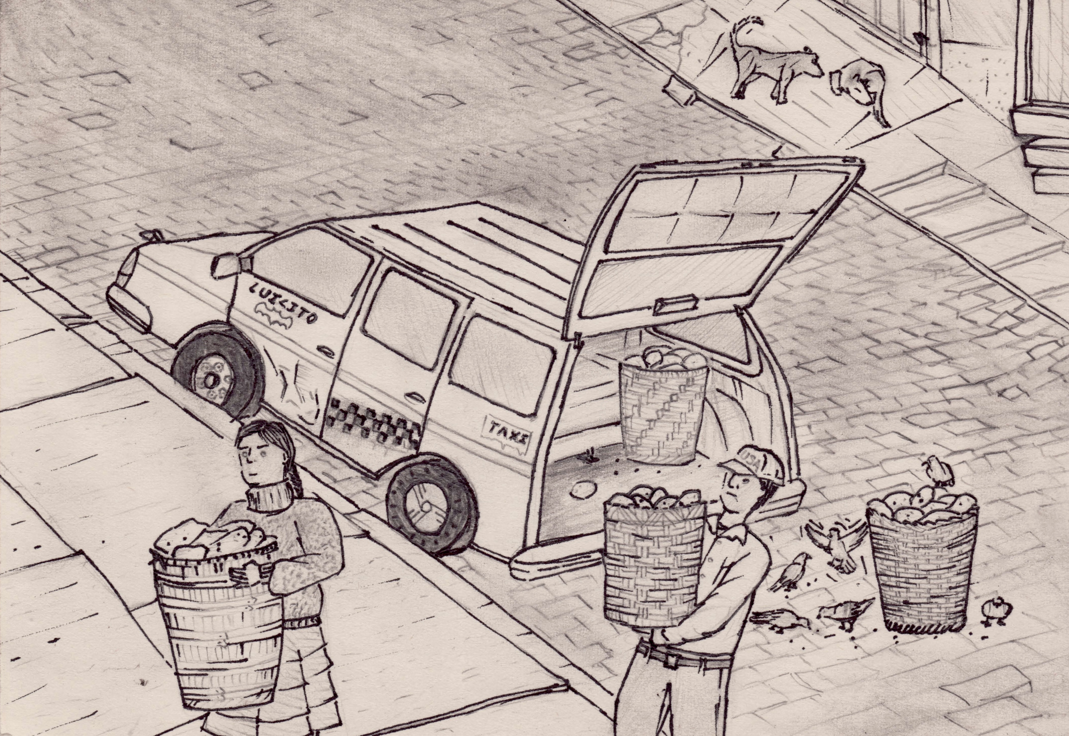 - El Alto (“the heights”) is technically the satellite city of La Paz, although it’s actually bigger and more populous. For true accuracy, a good rule is to imagine 3 more dogs than I drew to any given picture.
