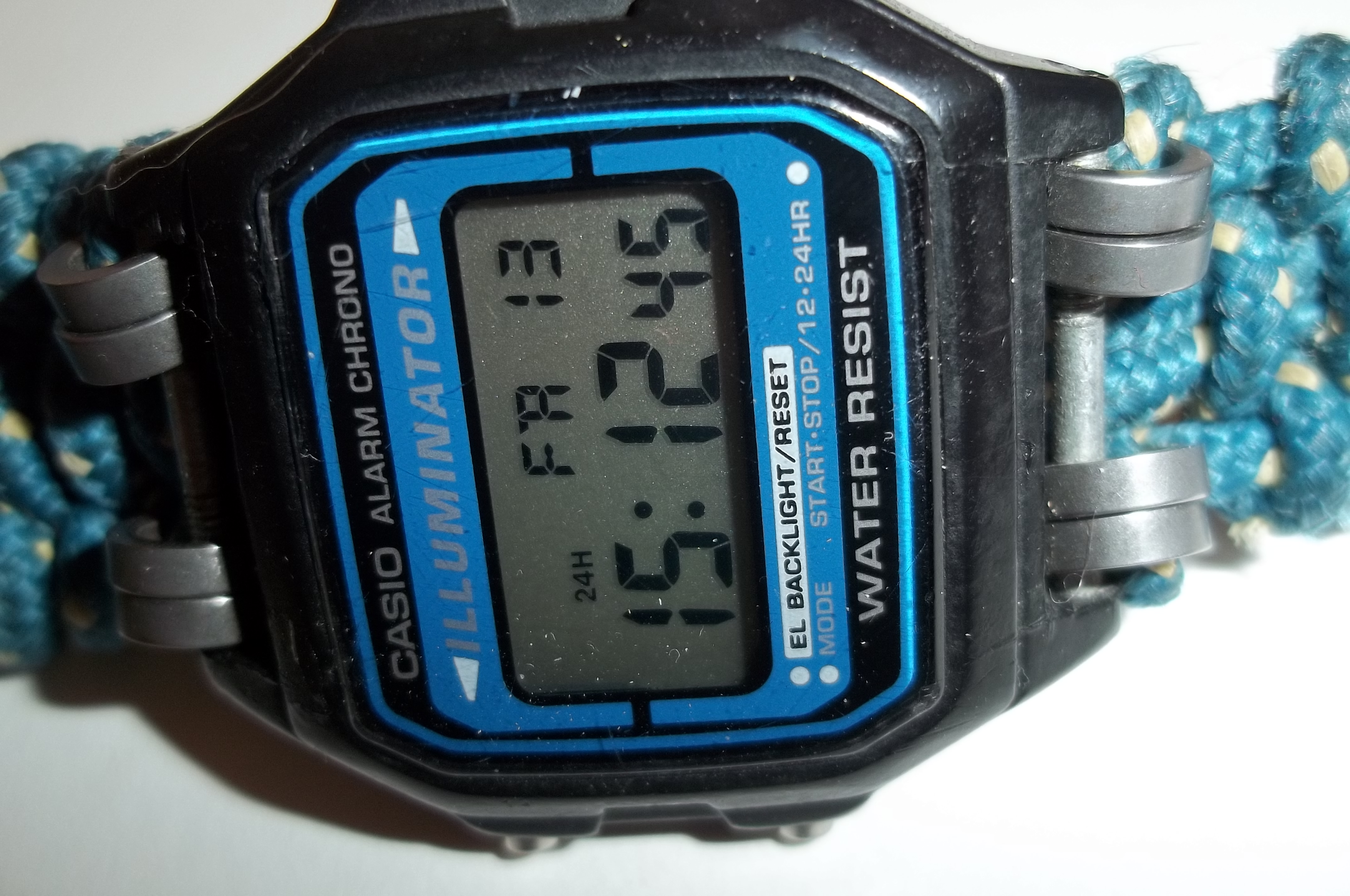 I got a Casio Water Resist for free because a damaged one was returned to MEC while I was working there as a bike mechanic. The vinyl strap was torn, but the piece seemed okay, so I heavily modified it. let’s zoom in.