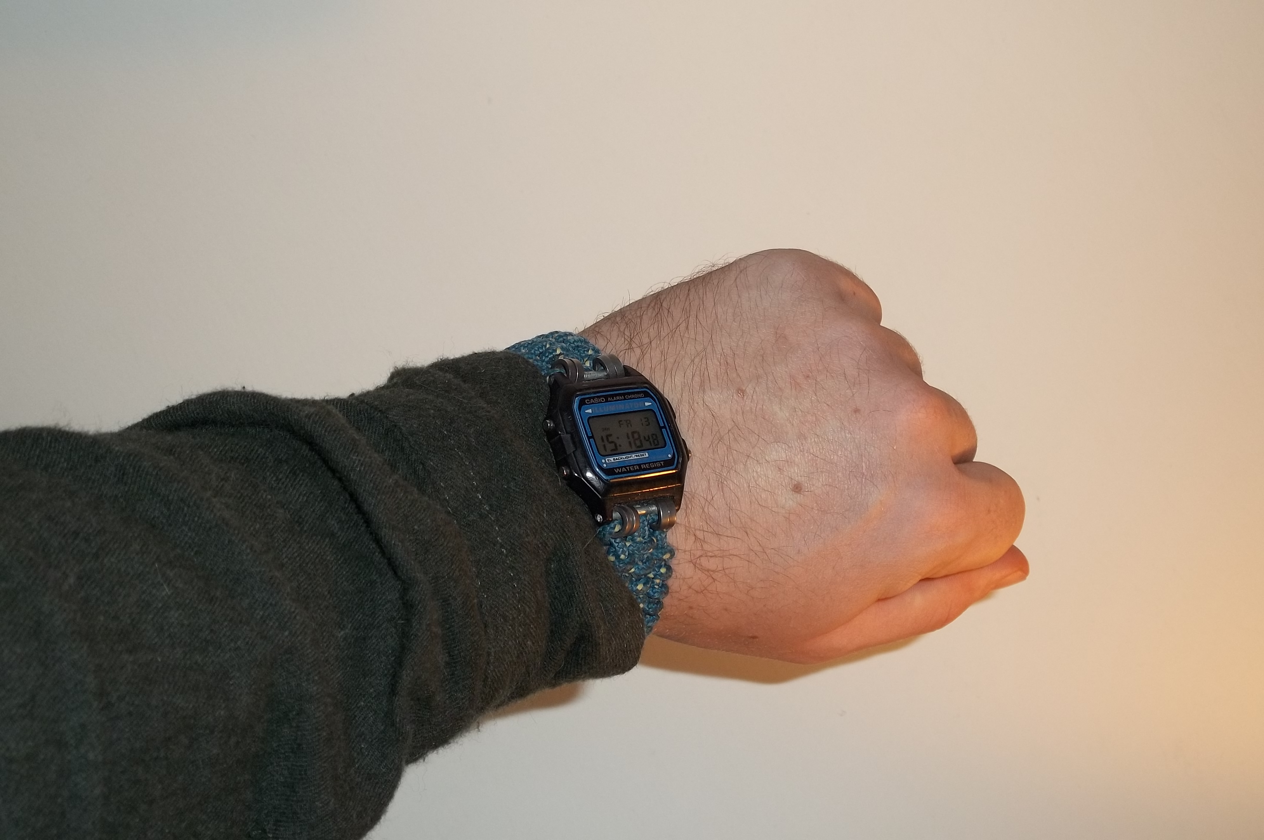 So, it’s a bit janky, I guess, and won’t win any awards for Exceptionally Elegant Design, but it’s basically indestructible. So far, it has been frozen, drown, coated in sawdust, crashed off a bike, and smeared with superglue which was subsequently sanded off. And, most importantly, it knows exactly what time it is.