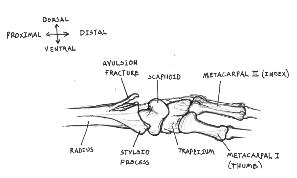 Apparently ice is slippery. On the upside, I didn’t get a bone fragment, I didn’t break my styloid, or my scaphoid, which are much more difficult to manage, and when it knits up, I should have a superbone.
