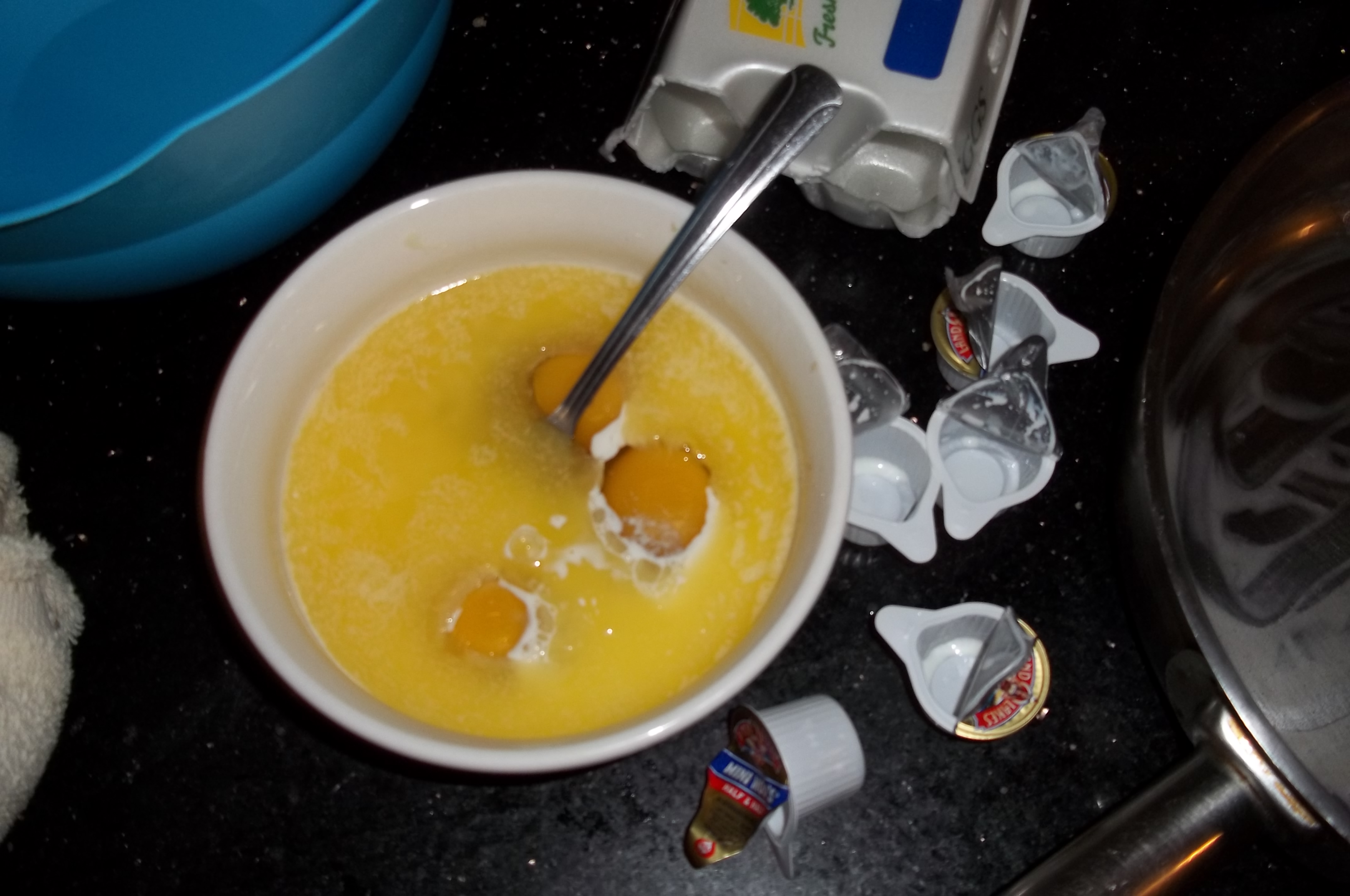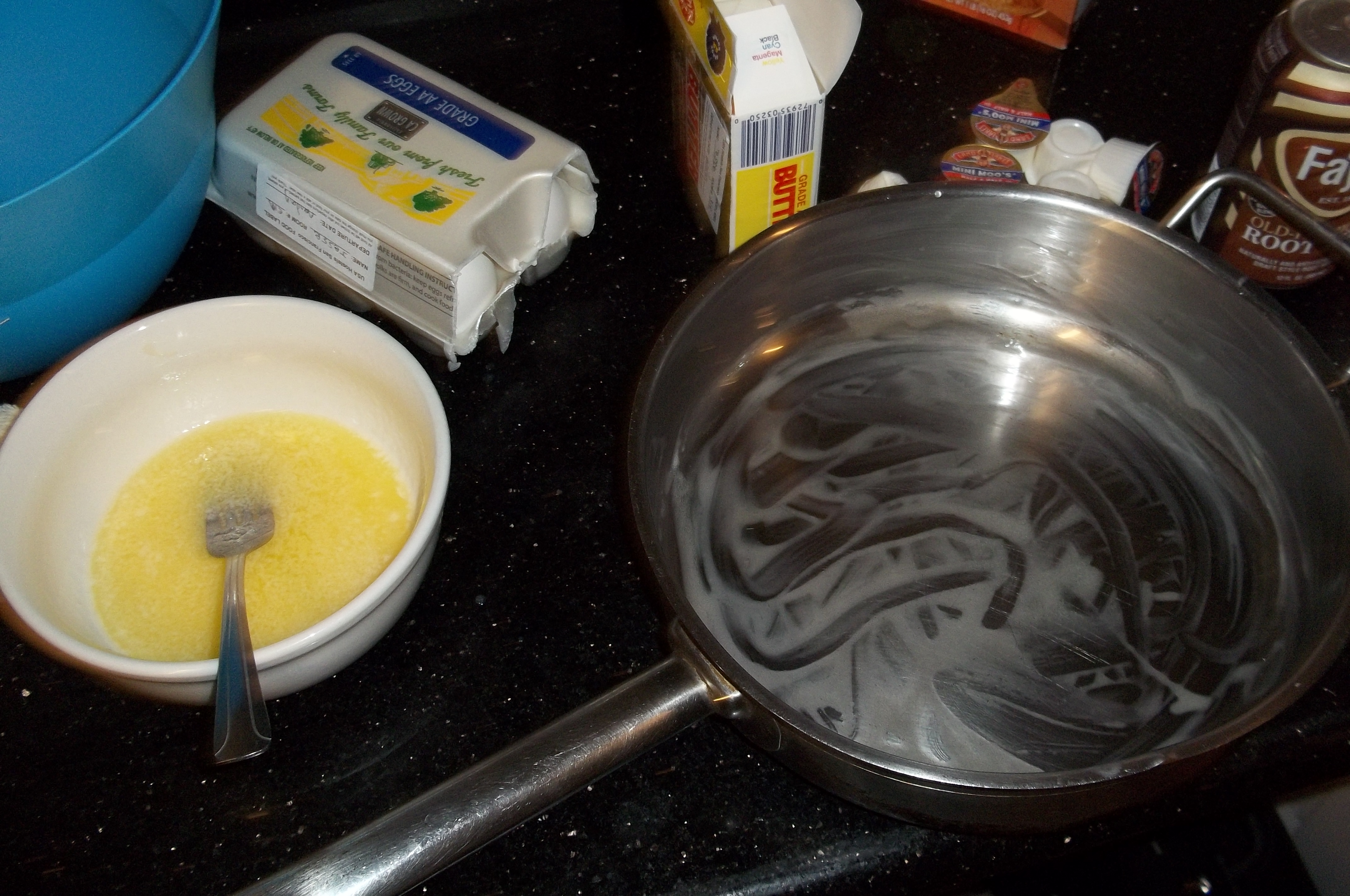 Anyways, I was off to the races. The root beer is going to fizz, so I needed it to mix almost instantly with anything that’s even remotely liquid. To that end, I melted the butter entirely, added some sugar, but not as much as I normally would because of the root beer. Half a cup maybe. I buttered the inside of the steel frying pan, which is the closest thing to a cake pan you can find. Mix in the sugar, then the eggs and cream. part of the plan here is that the root beer will curdle the cream, which will create the stretchy protein structures needed for bubbly delicious cake.