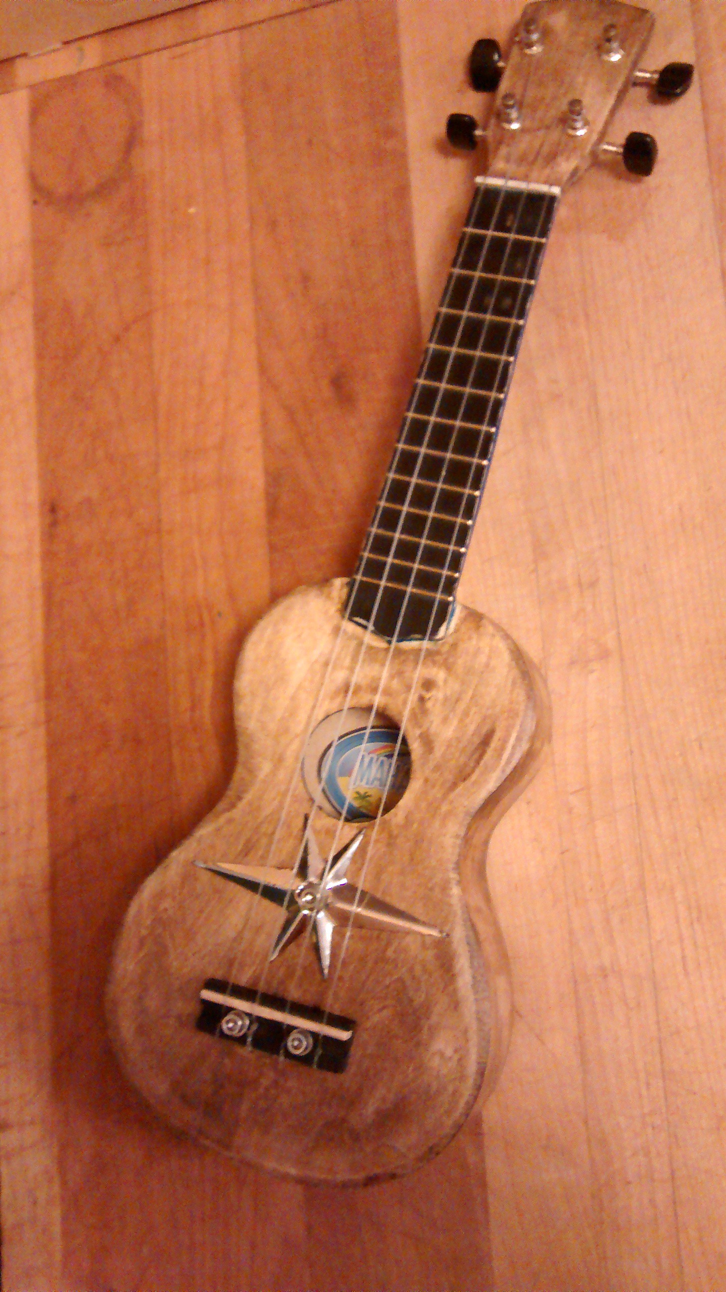 It’s an intentionally rough finish and stain Although it might be a little more rustic than I was planning. It’s been urethaned and sanded smooth. The bridge got drilled, superglued and remounted with some m5 bottle cage bolts. If it pulls out again, the ukulele is over. The star is off a vintage laundry hamper, and I’ve been looking for an awesome place to put it for years. I left the back of the neck in the original blue just so I didn’t have to sand it smooth, because I’m not sure I have it in me to get a factory finish on it.